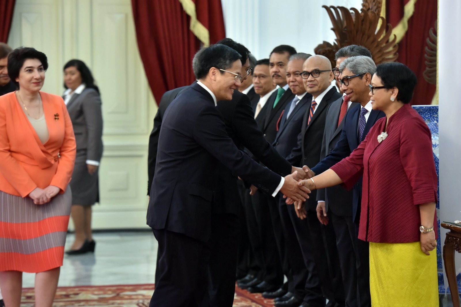 Menlu Retno Marsudi didampingi jajarannya menerima jabat tangan delapan duta besar baru…
