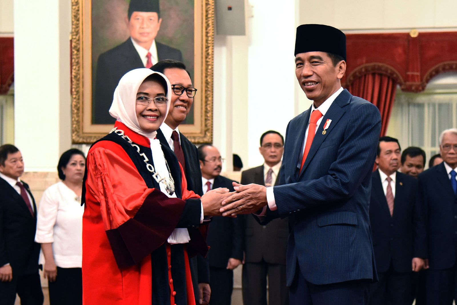 Presiden Jokowi memberikan ucapan selamat kepada Enny Nurbaningsih yang baru diambil sumpahnya…