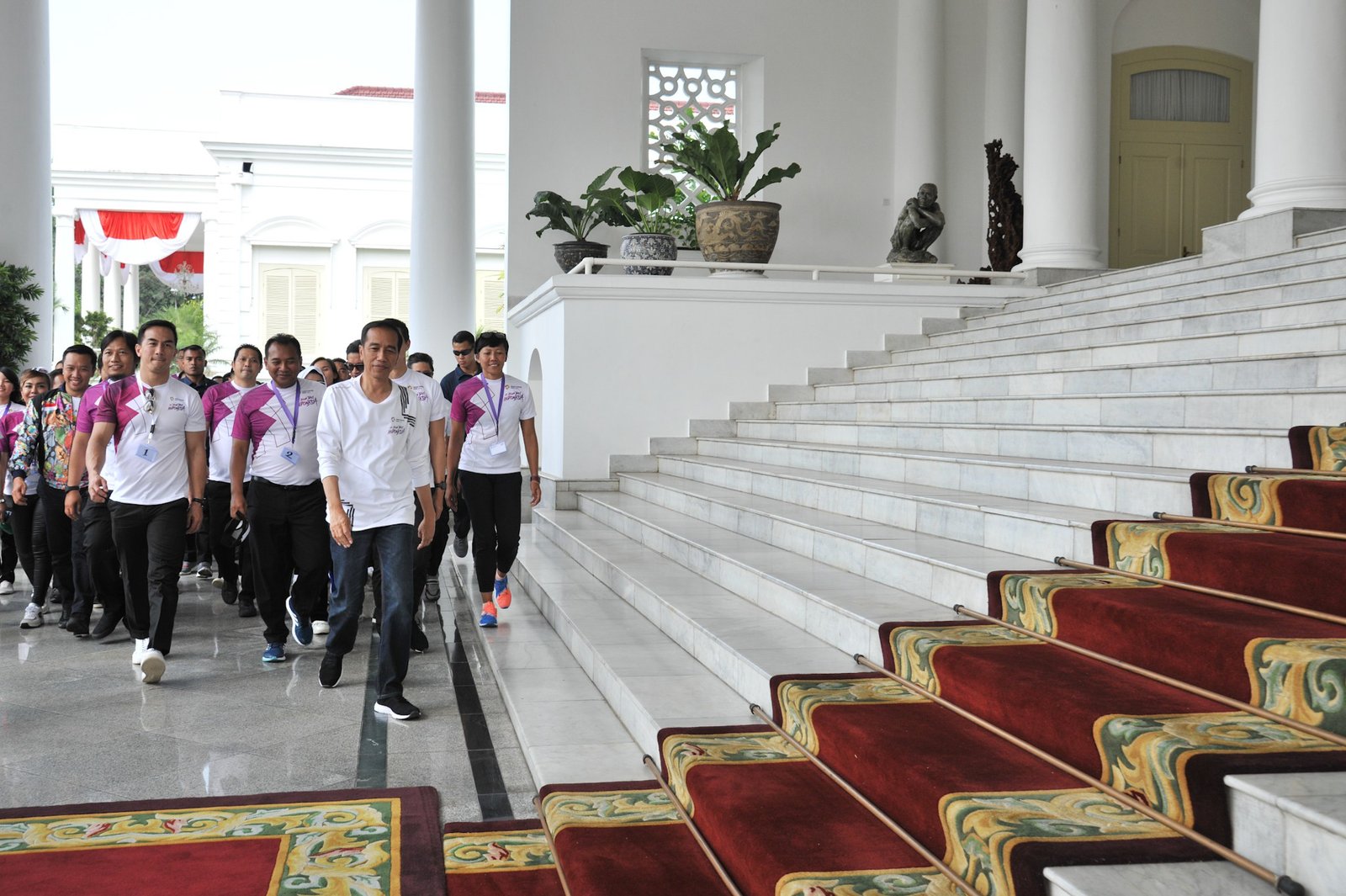 Presiden berjalan bersama para atlet di halaman belakang Istana Kepresidenan Bogor, Jawa…