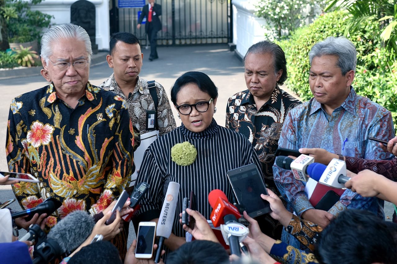 Menlu Retno Marsudi menjawab pertanyaan wartawan usai mendampingi Presiden Jokowi bertemu Menlu…