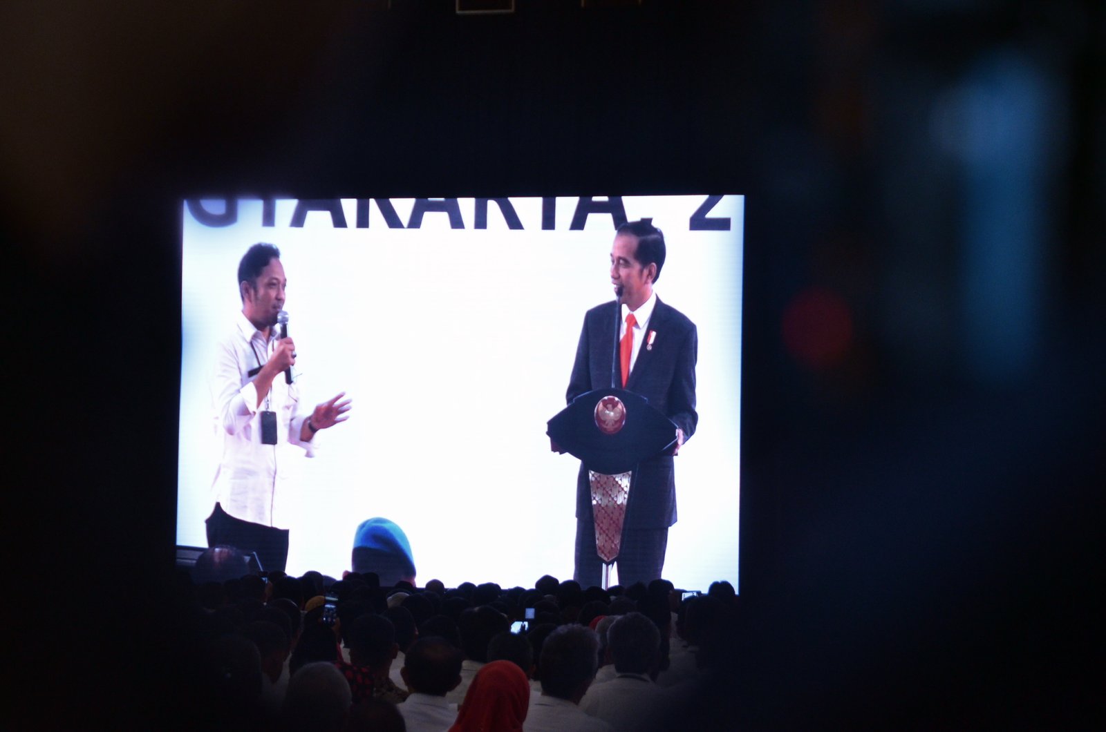 Presiden Jokowi berdialog dengan peserta saat mengisi acara di Graha Pradipta Jogja…