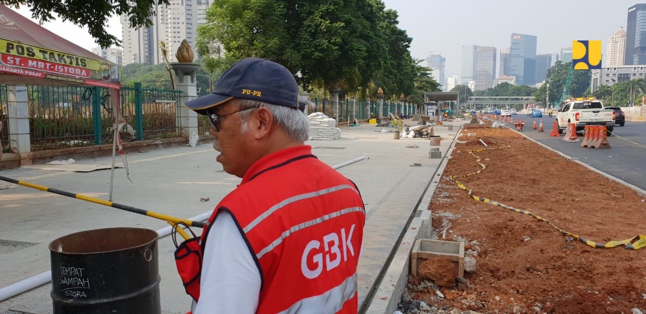 Menteri PUPR saat meninjau progres pembangunan pekerjaan di Kompleks GBK dan trotoar…