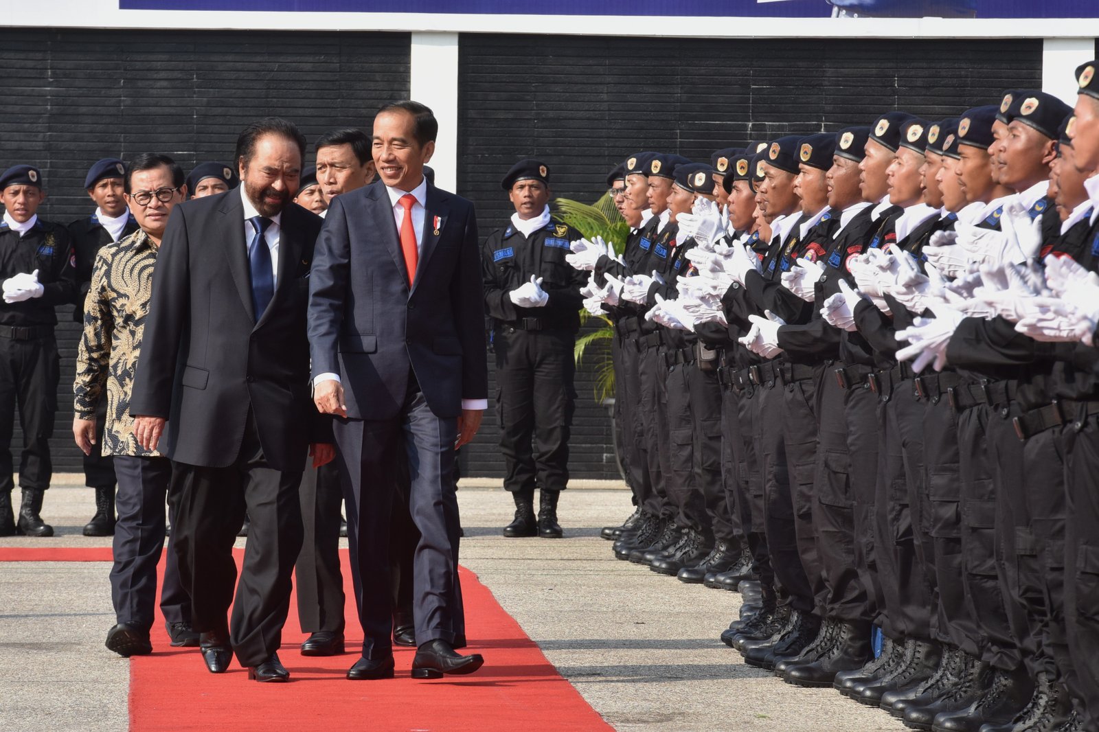 Presiden Jokowi berjalan ke ruang acara Pendidikan Bela Negara Partai Nasdem, di Gedung ABN…