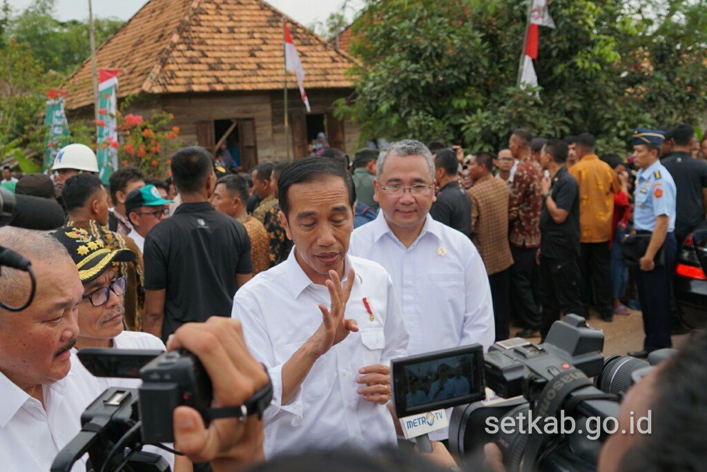 Presiden menjawab pertanyaan wartawan usai meninjau proyek padat karya di Banyuasin, Sumsel,…