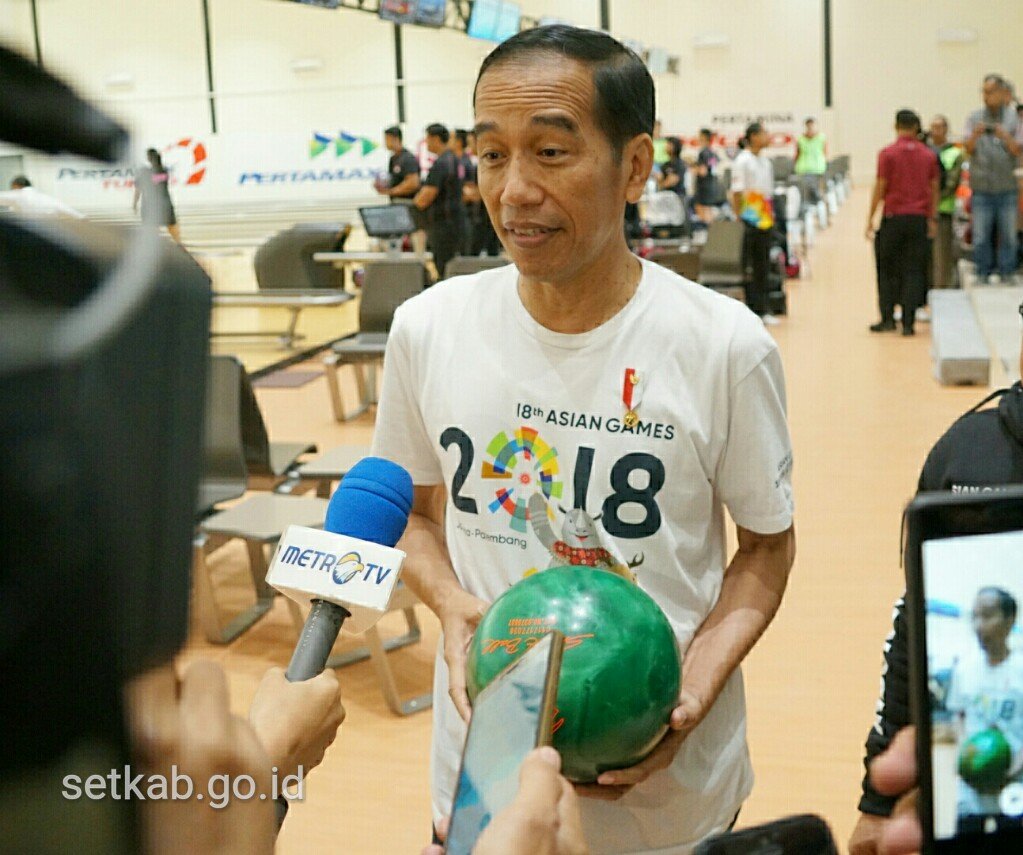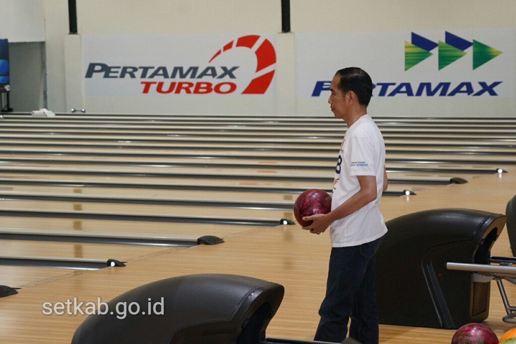 Presiden Jokowi menjajal arena bowling di Jakabaring Sport City, Palembang, Sumsel, Sabtu…
