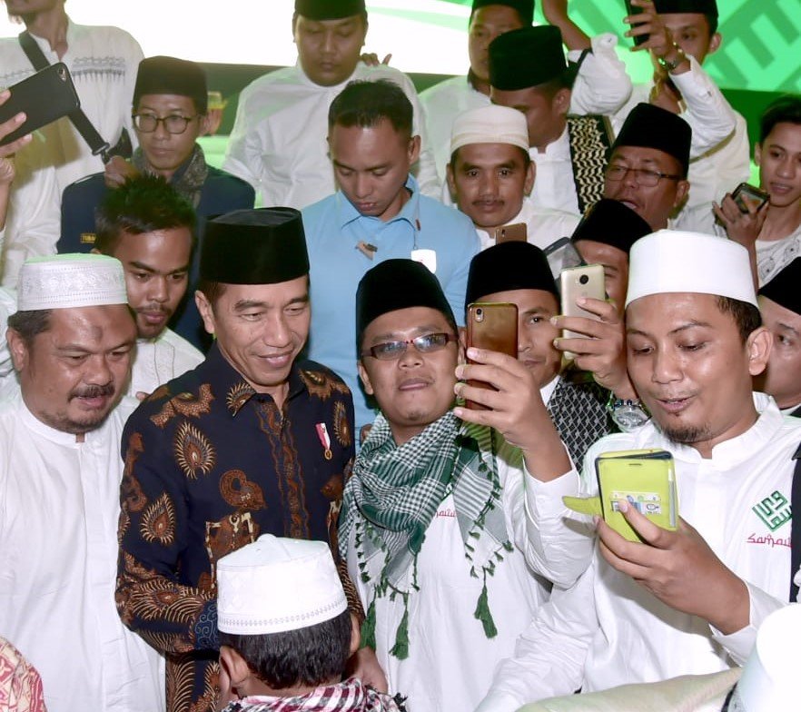 Presiden Jokowi melayani permintaan selfi pada Halalbihalal dan Silaturahim dengan Solidaritas Ulama…