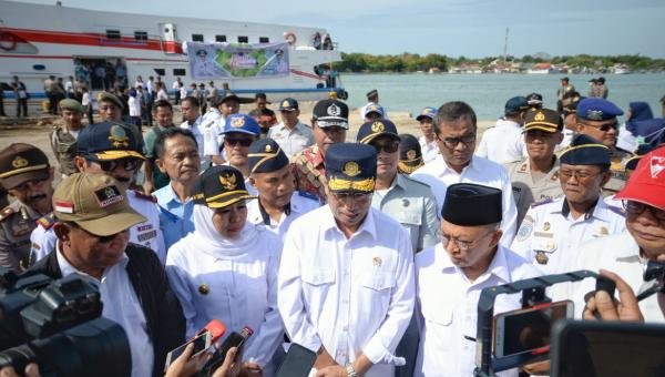 Menhub bersama Gubernur Jatim menjawab pertanyaan wartawan di Pelabuhan Kalianget, Kabupaten Sumenep,…