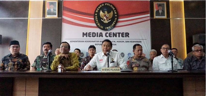 Menko Polhukam Wiranto didampingi Panglima TNI, Kapolri, dan Mahfud MD dari Suluh…