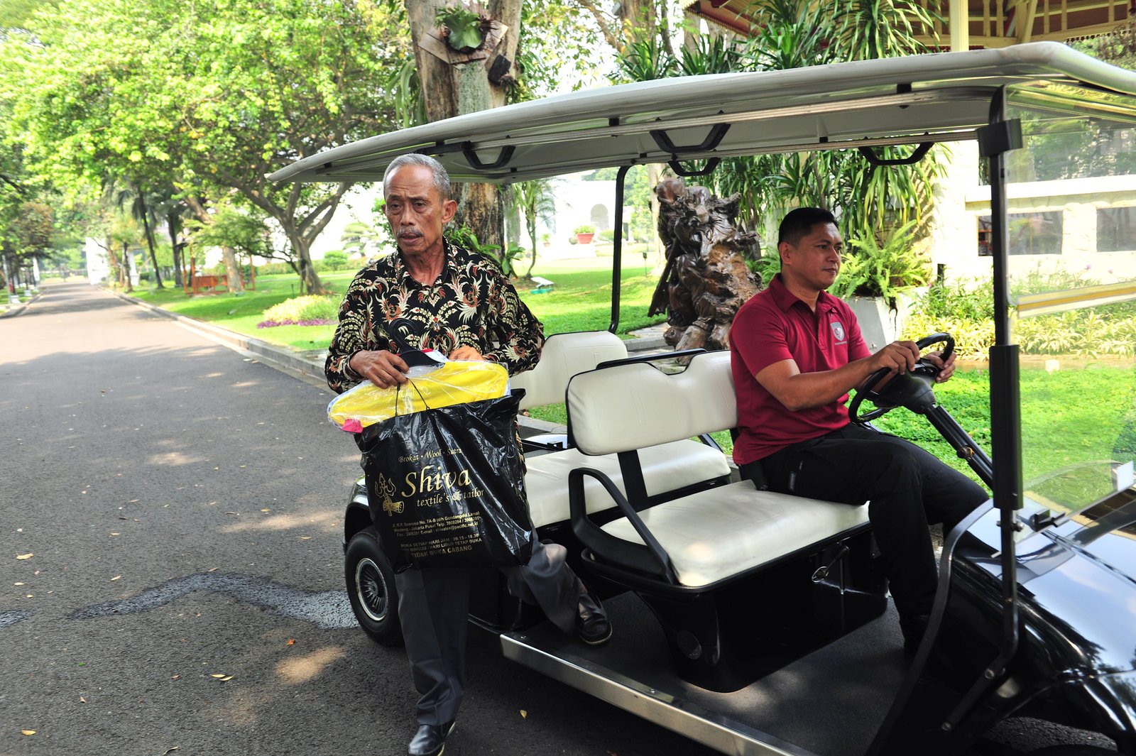 Usma, pedagang yang menjadi korban kerusuhan 22 Mei, turun dari mobil golf…