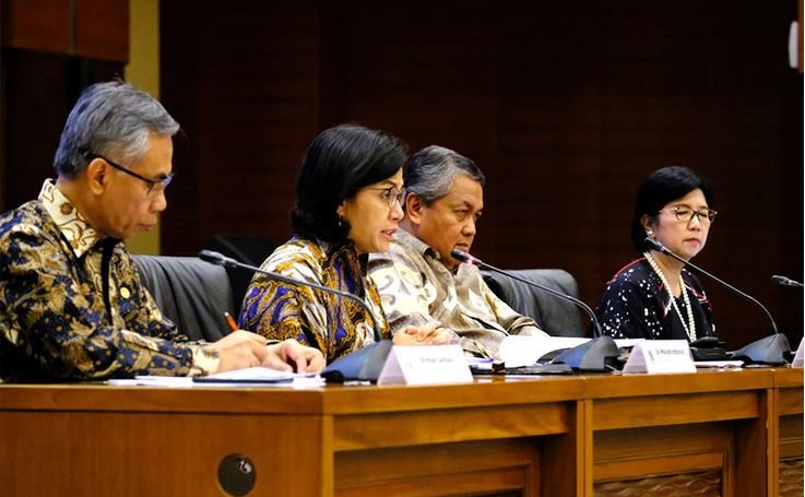Menkeu Sri Mulyani Indrawati didampingi Gubernur BI, Deputi Gubernur BI, dan Ketua…