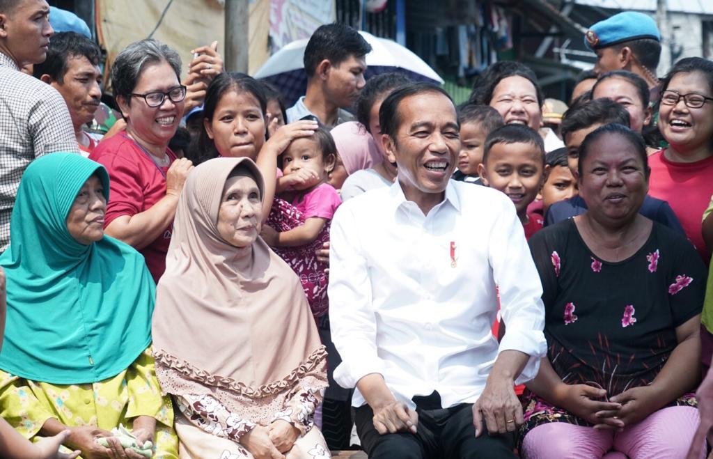Presiden Jokowi berbincang dengan warga sebelum berpidato di Kampung Deret, Kecamatan Johar…