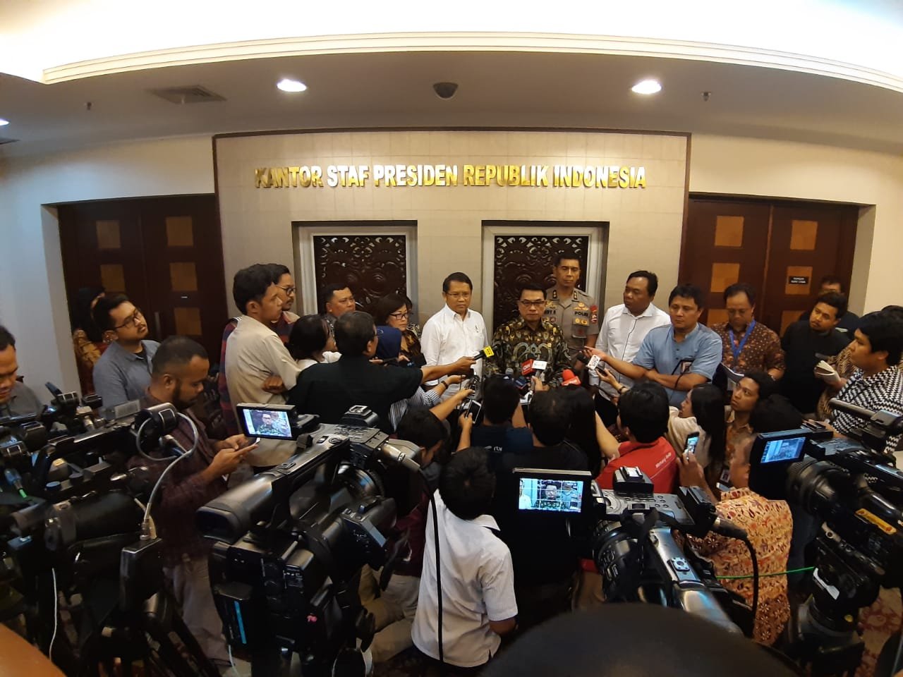KSP Moeldoko didampingi pejabat terkait menyampaikan keterangan pers mengenai Rakor Arus Mudik…