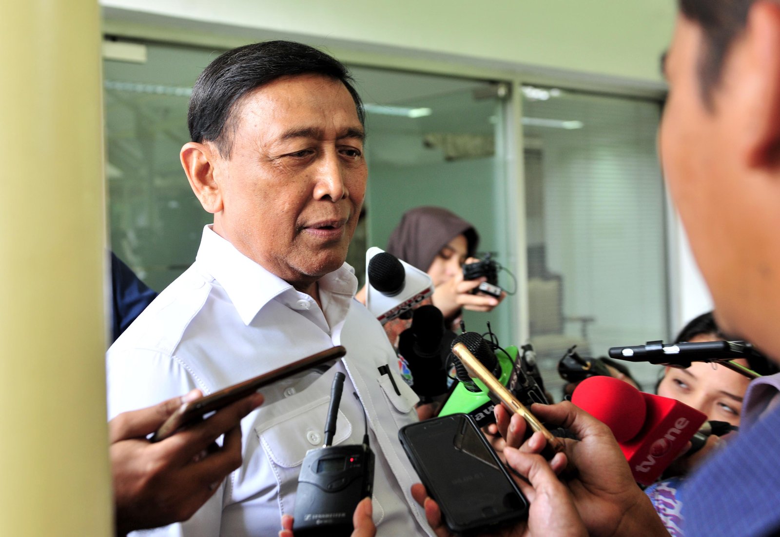 Menko Polhukam Wiranto menjawab wartawan usai menghadiri rapat terrbatas, di Kantor Presiden,…