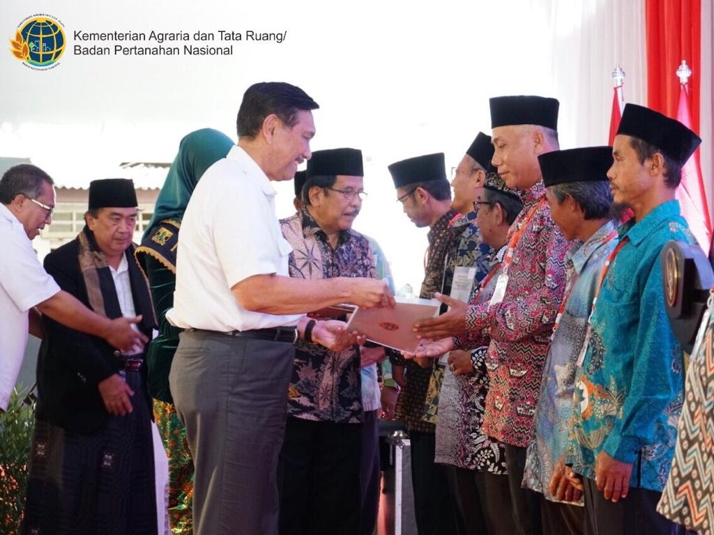 Menko Luhut dan Menteri ATR/Kepala BPN saat menyerahkan simbolis sertifikat wakaf di…