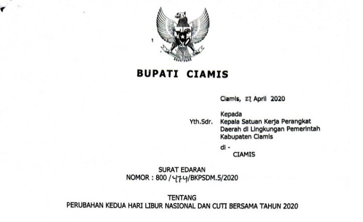 Surat Edaran Bupati : Perubahan Kedua Hari Libur Nasional Dan Cuti Bersama Tahun 2020