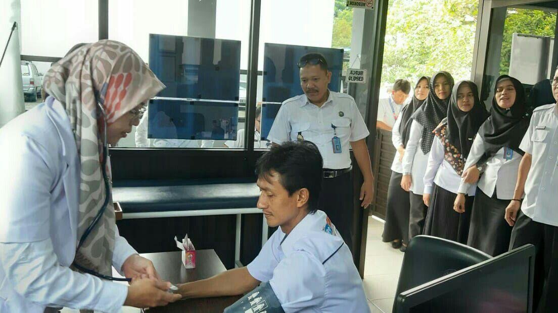 Kepala BNNK Ciamis, Engkos Kosidin sedang memantau pemeriksaan kesehatan pegawainya terkait dengan…