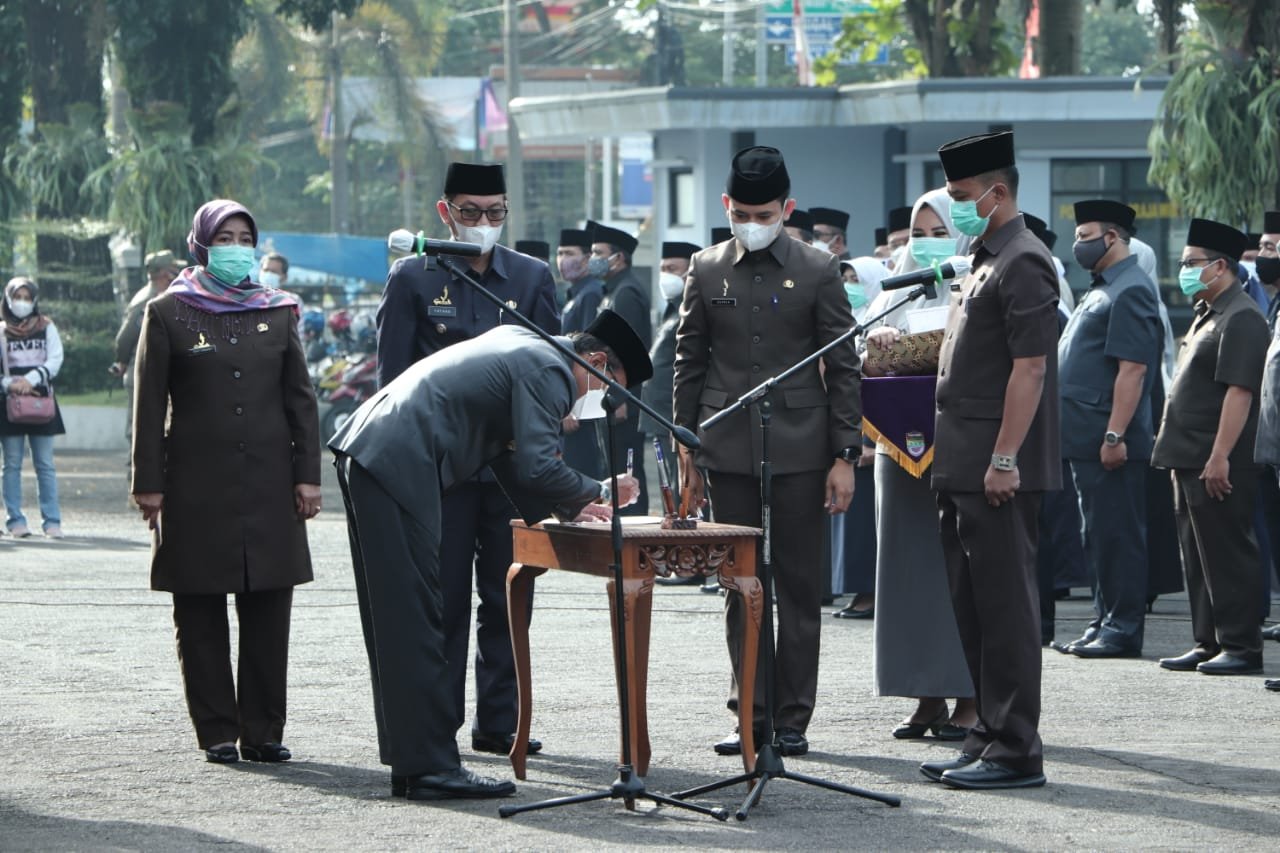 Bupati Ciamis, Herdiat Sunarya menandatangani Berita Acara Pelantikan 112 Aparatur Sipil Negara…