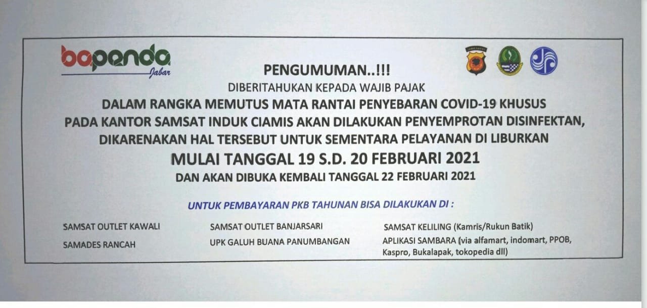 38 terkonfirmasi Positif Covid-19 OTG Kantor Pusat P3D (Samsat Induk Ciamis) Tutup Sementara.
