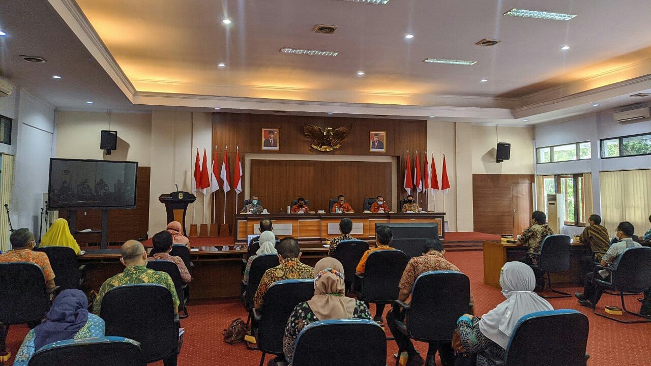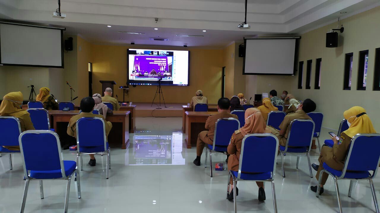 Para peserta forum konsultasi publik sedang menyimak sambutan Bupati Ciamis yang disiarkan…