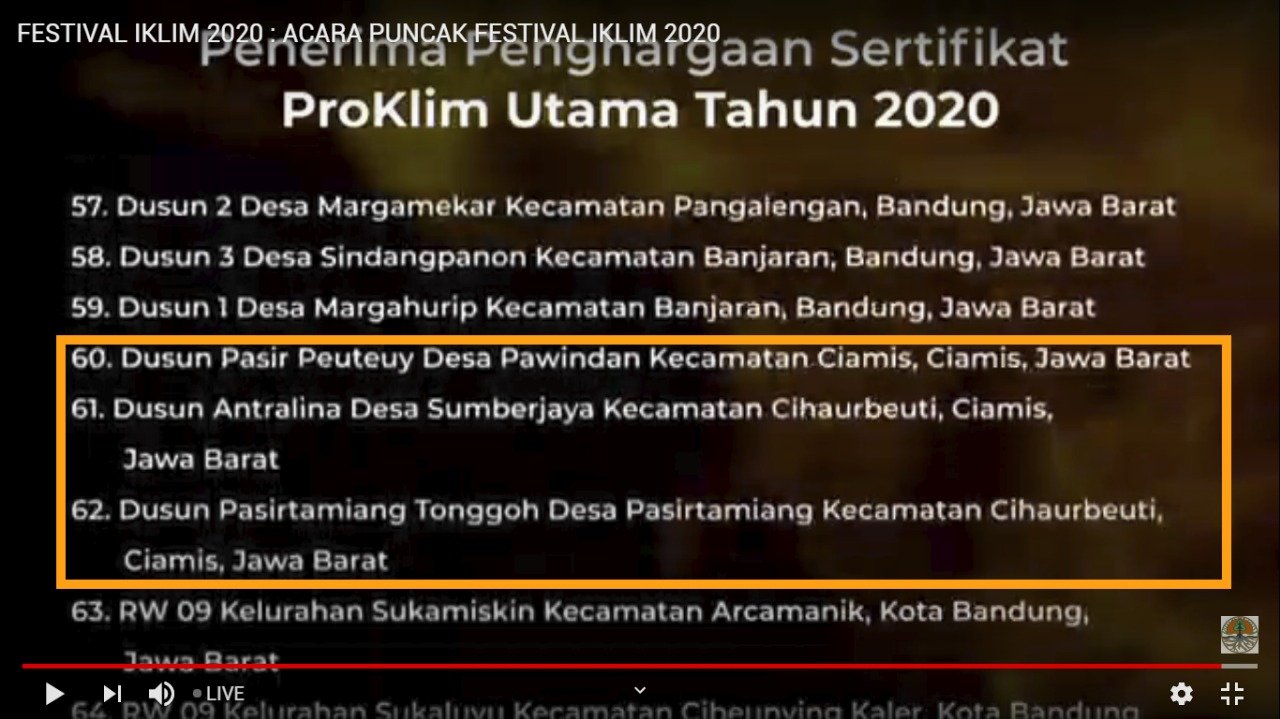 3 Desa di Kabupaten Ciamis menerima penghargaan Sertifikat Proklim Utama dari Kementerian…