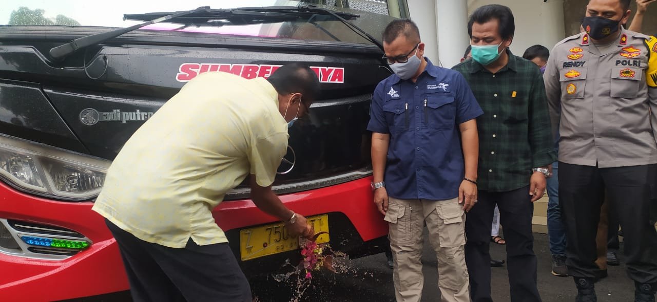 Bupati Ciamis, Dr. H. Herdiat Sunarya memecahkan kendi ke badan Bis pada…