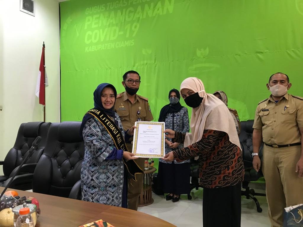 Bunda Literasi Kabupaten Ciamis, Hj. Kania Ernawati Herdiat menyerahkan Piagam Penghargaan dari…