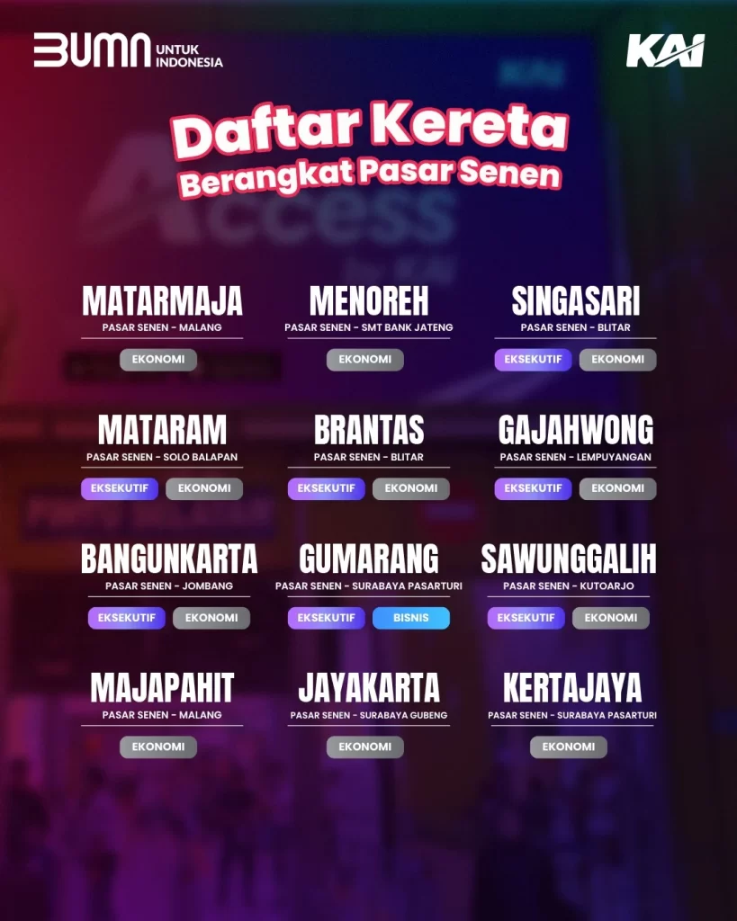 Berikut daftar KA yang mendapatkan promo Mudik Belakangan Ekstra Hemat keberangkatan Stasiun Pasarsenen: