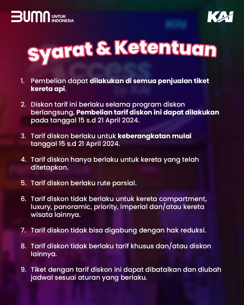 Promo berlangsung pada periode 15 s.d 21 April 2024 untuk KA-KA tertentu pada kelas eksekutif, bisnis, dan ekonomi dengan tanggal keberangkatan KA tanggal 15 s.d 21 April 2024. Tiket promo ini dapat dipesan melalui aplikasi Access by KAI, website kai.id, online travel agent, serta mitra pemesanan lainnya.