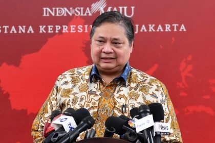 Menteri Koordinator (Menko) Bidang Perekonomian Airlangga Hartarto menyampaikan keterangan pers di Kompleks…